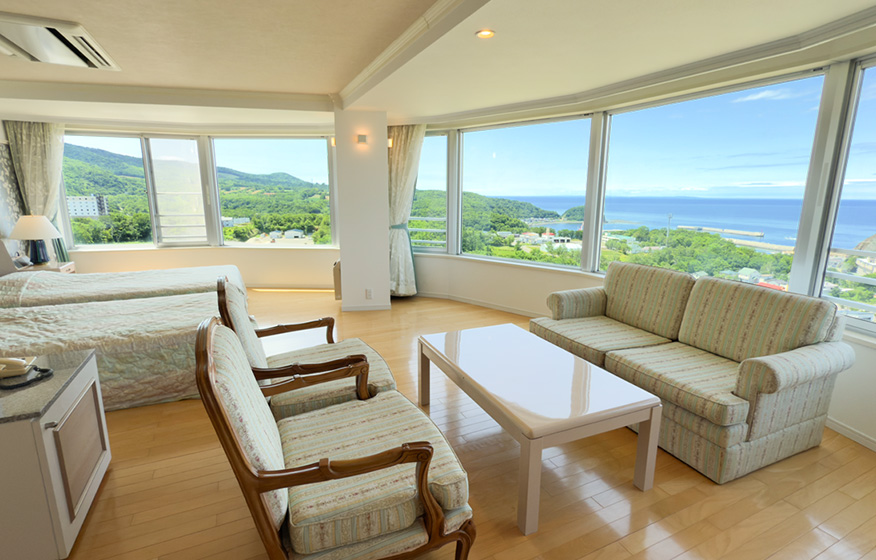 窓際にワーキングスペースを備えたコーナーデラックスルームなら、仕事の合間もオホーツクの絶景で気分転換。