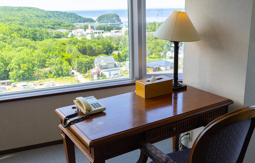 窓際にワーキングスペースを備えたコーナーデラックスルームなら、仕事の合間もオホーツクの絶景で気分転換。