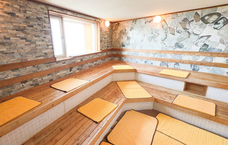 ゆったりとした2段構造のカラカラサウナは、室温約90度で、最大8名まで利用可能。